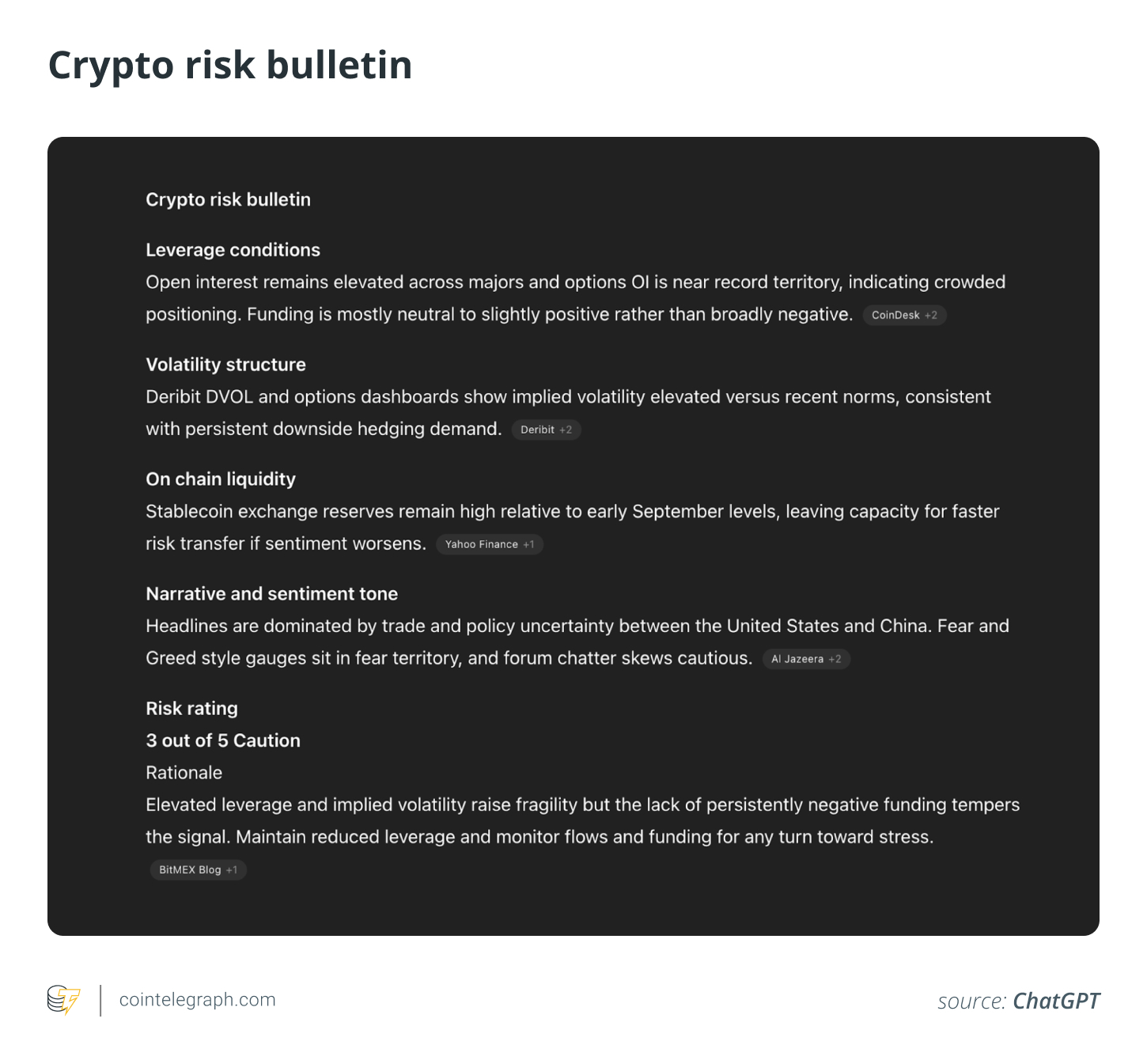 “Agisci come analista del rischio del mercato delle criptovalute. Crea un breve bollettino sui rischi utilizzando i dati forniti. Riassumi le attuali condizioni di leva finanziaria, la struttura della volatilità dei prezzi e il tono del sentiment dominante. Assegna infine una valutazione del rischio da 1 a 5 (1 = Basso, 5 = Critico) con una breve giustificazione. “