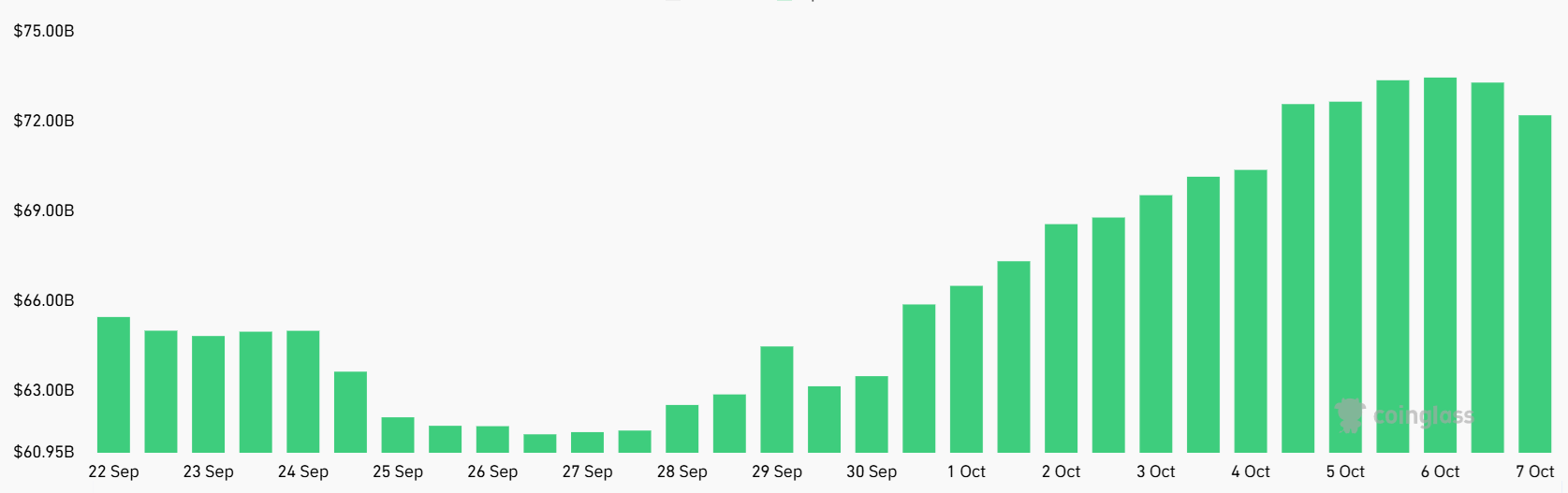 Bitcoin Vadeli İşlemlerinin büyük borsalardaki açık pozisyonu Pazartesi gününden bu yana %2 oranında düşüş göstermesine rağmen şu anda 72 milyar dolar seviyesinde. Derin ve likit bir türev piyasası, hedge fonlarının ve küresel varlık yöneticilerinin girişlerini çekmek için, bu talep kısa pozisyonları içerse bile çok önemlidir.